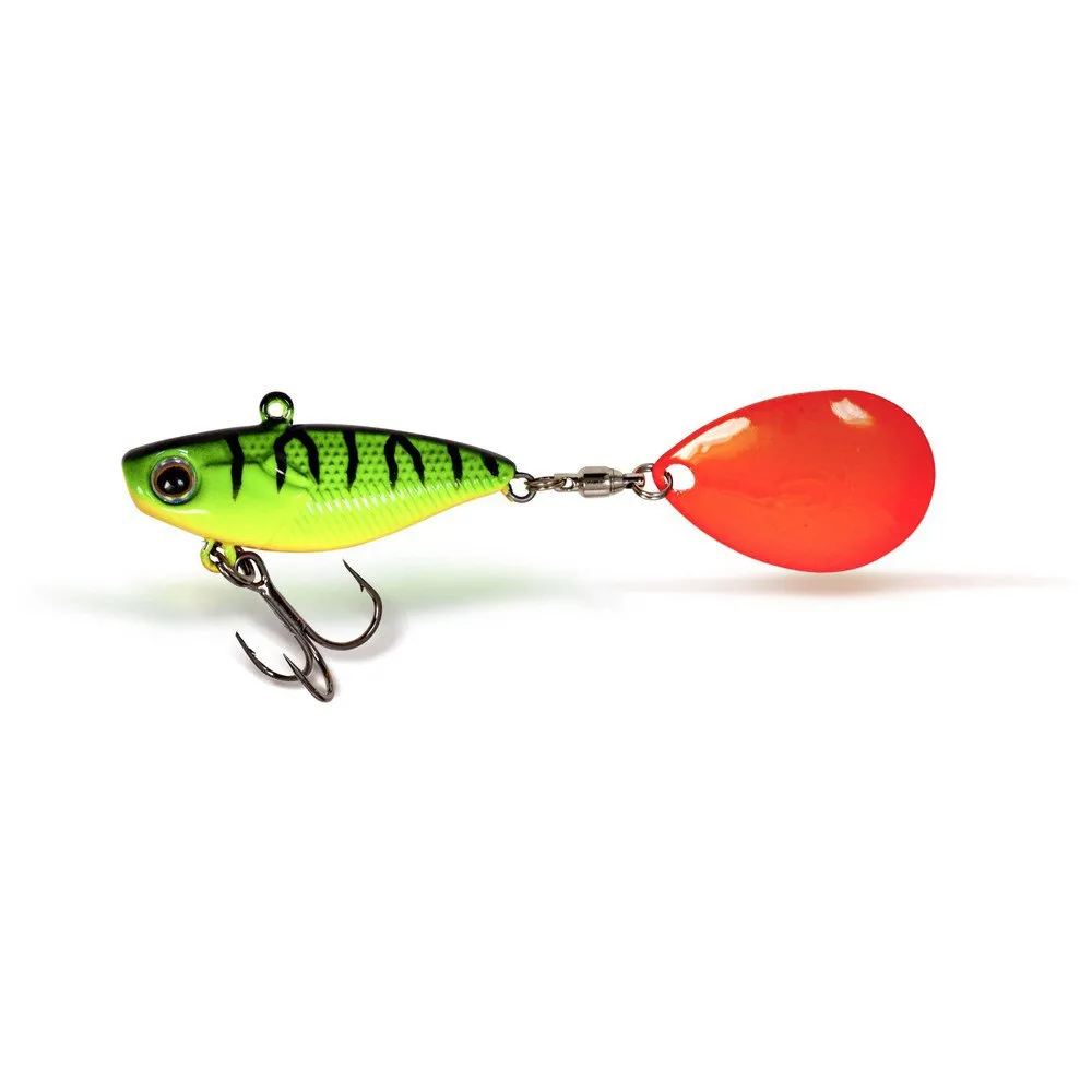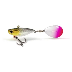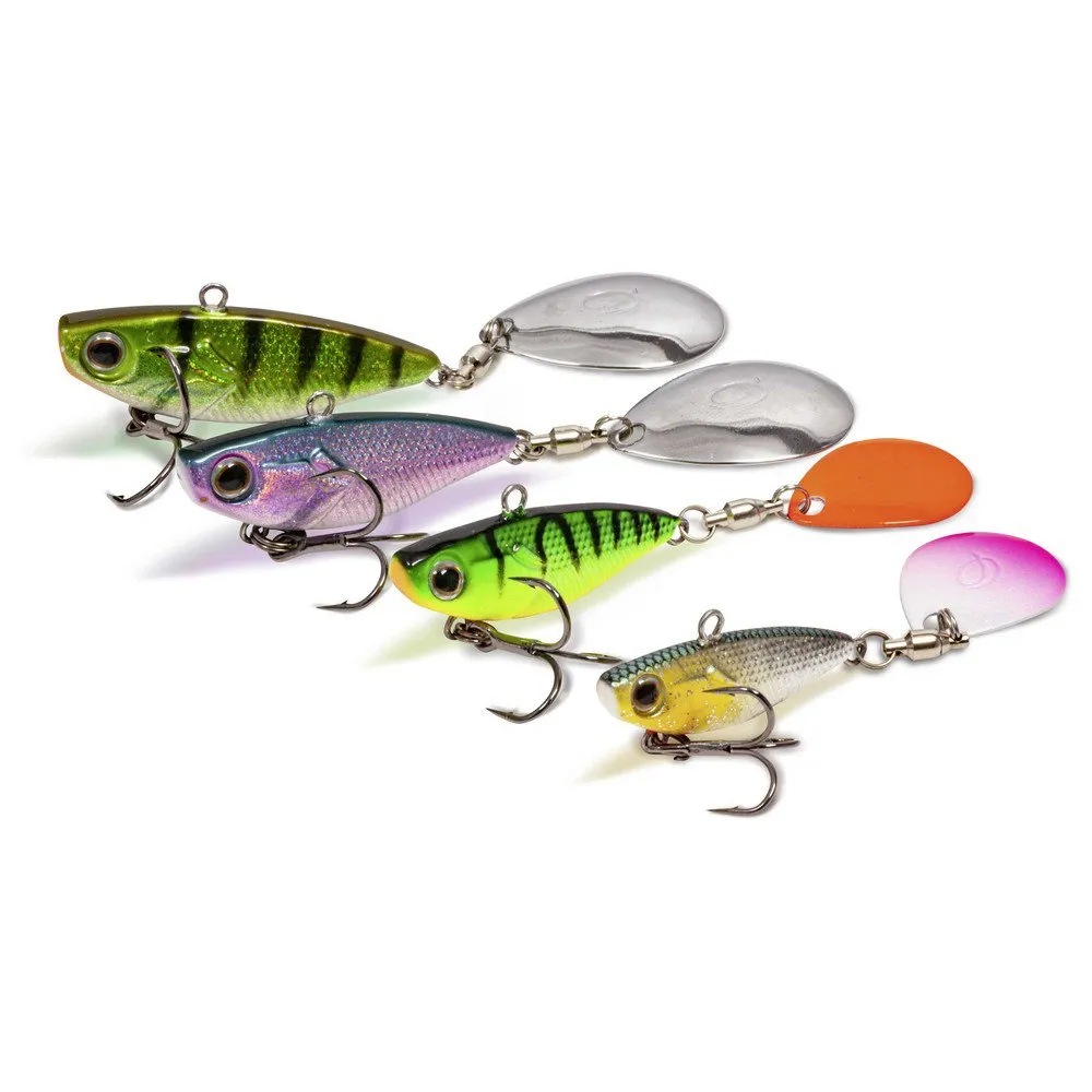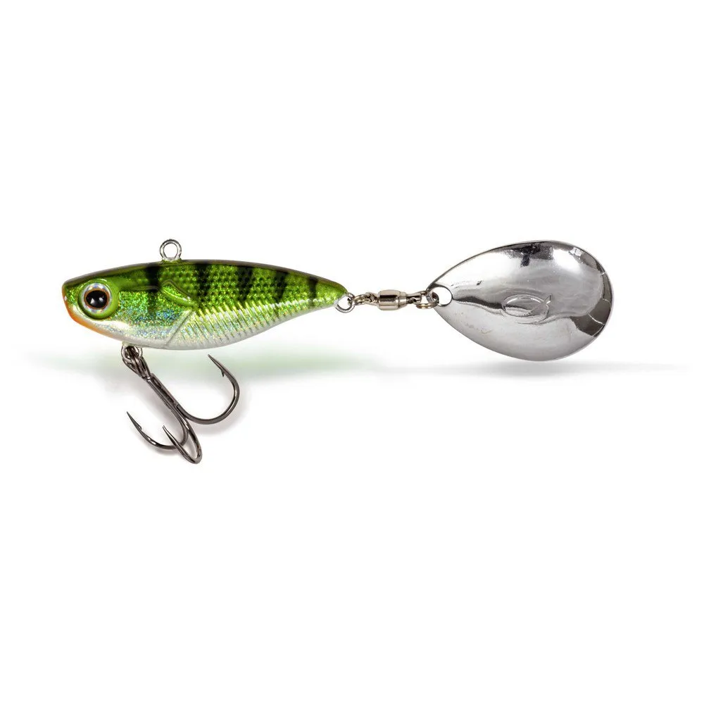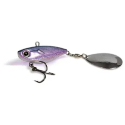 Spin jigs are compact weight heads fitted with both a treble hook and a rotating spinner blade.