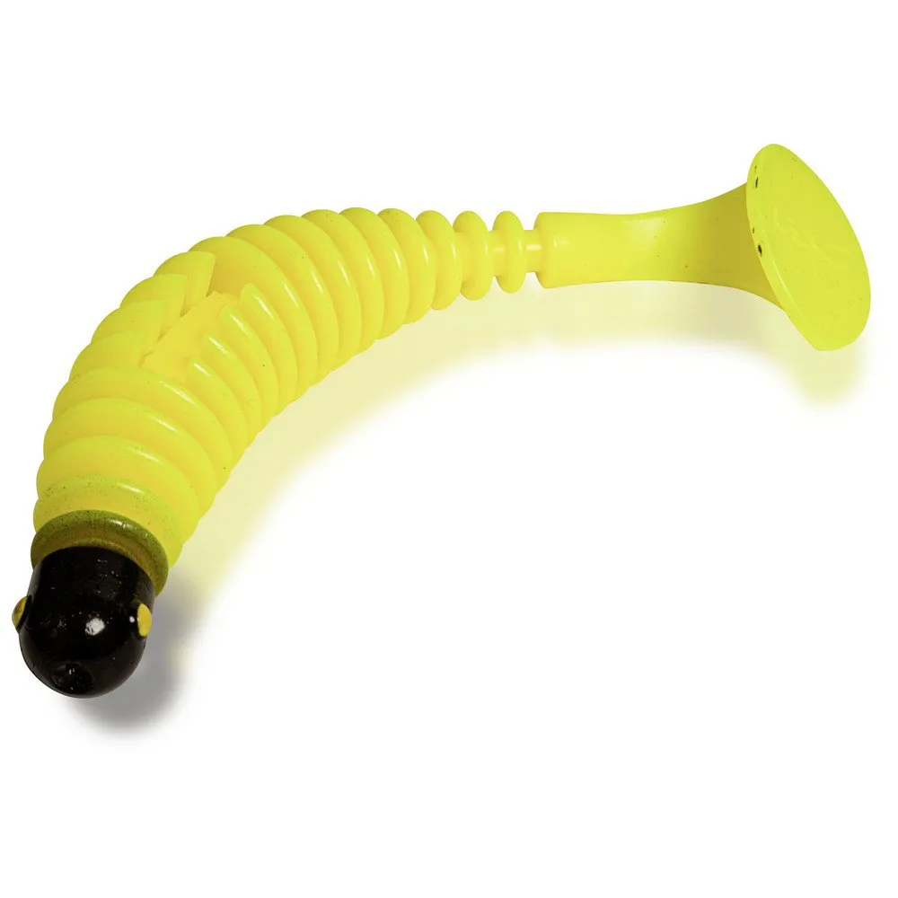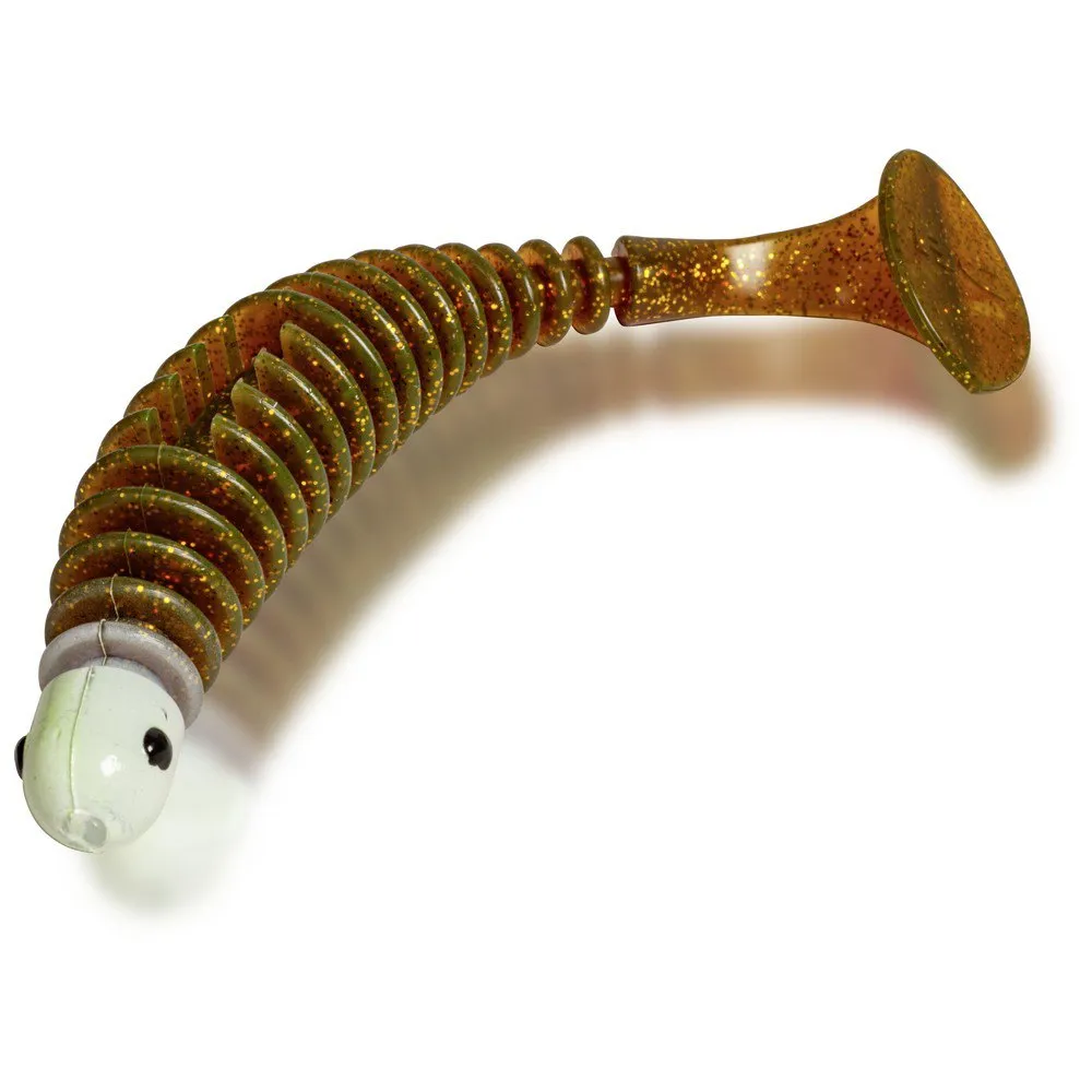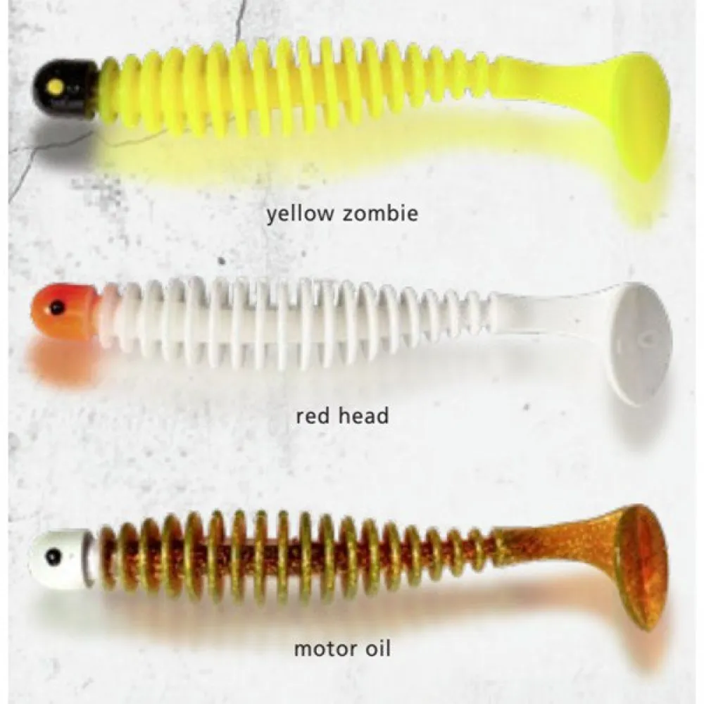 The convex shape, resembling a fish skeleton and comprising several soft, successive rubber ribs, perfectly imitates the swimming action of likely prey.