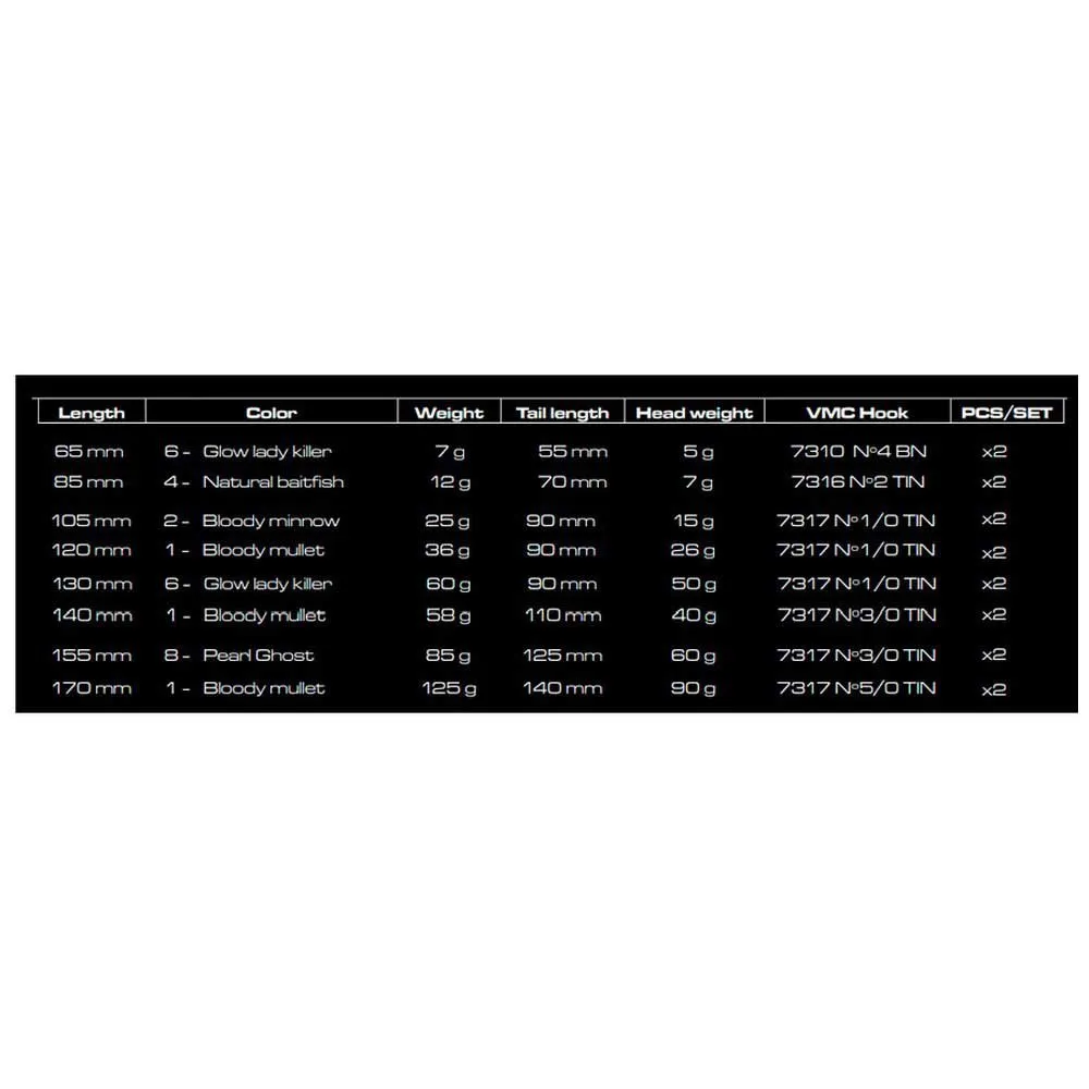 Crafty Candy belongs to the hybrid soft lures family, since it combines a metal jig head with a vinyl tail. The very softbody texture is extremely reactive to any movement in the water, realistically imitating a fish alive. To change the tails it is necessary to use the cement provided or a similar one. Equipped with high quality VMC hooks. To change them is very easy. Just introduce the hole of the hook ring in the steel connection of the jig head, pulling backwards lightly till a “click” is heard. You could say CRAFTY CANDY is the heir of the mythic CRAFTY MINNOW in “soft bait” version, since the shape of the sharp head, body and scales are based on it. It is available in diverse and attractive colors combining different color patterns, including golden shines and flashy colors.