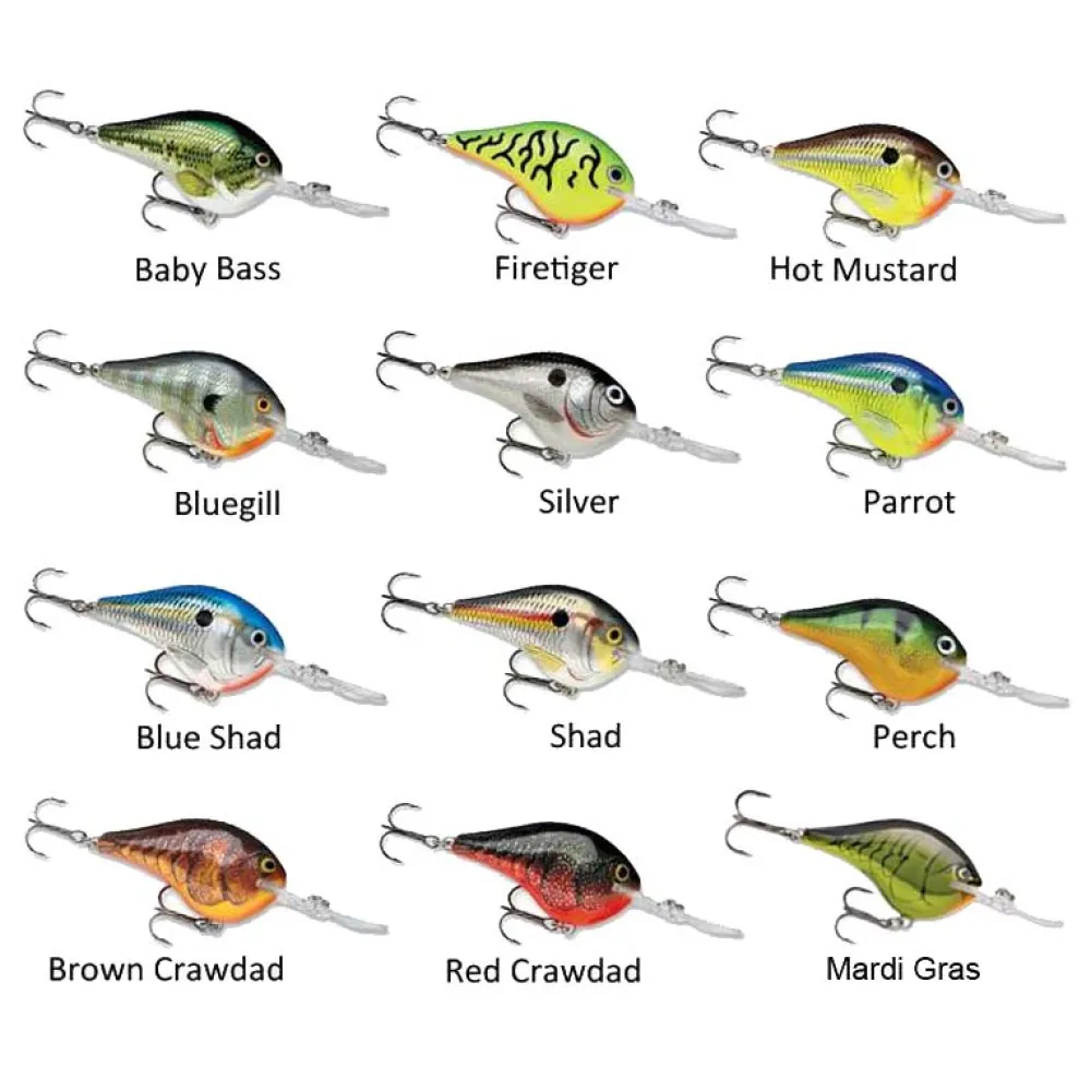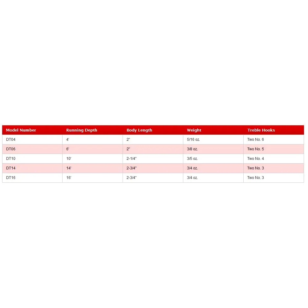 The DT® (Dives-To) series of crankbaits, dive fast to a preset depth and stay in the ?strike zone? longer than any than other crankbait on the market. Made from the top seven percent of balsa wood, this consistently perfect wood combined with carefully placed internal weights, tapered fuselage and thin tail design creates the ultimate crankbait action, found only in the DT family. Ultra-thin polycarbonate lip digs the bait down quickly to desired depth. Swimming with a side-to-side action only balsa crankbaits can achieve, the DT cranks deep, yet pulls with ease. Perfectly weighted to rest in a ?quick-dive? nose down position allowing for immediate descent to desired depth, the DT® can be easily cast 150 feet. Simply put, the farther the cast, the longer the bait stays in the strike zone. Its the most effective way to cover more water and catch more fish. Internal baritone rattle is tuned for best sound performance. Premiere finishes in all the right color patterns, finished with 3D holographic or painted eyes. All come with premium VMC® black nickel hooks. Each lure is hand-tuned and tank-tested to swim perfectly right out of the box.