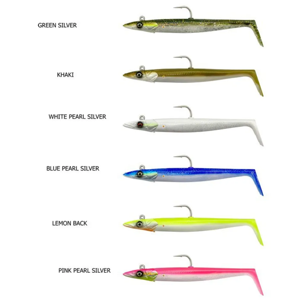Sandeel V2 With a lively kicking action on both the drop and the retrieve, this super realistic sandeel imitation will fool even the wariest of predator fish. The unique jig head helps to ensure the lure moves with a perfect rolling and darting action. The Pro Peg body holder makes it possible to peg the body to the head with a toothpick, creating a very simple and secure hold. The soft PVC body comes pre-rigged with an internal glass rattle that gives off a provoking sound to any nearby hunting fish.