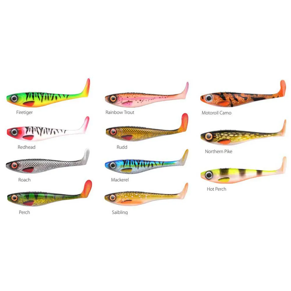 The Iris Pop-Eye softbaits are true ´´eye-catchers´´. These lures are developed as the ultimate all-round softbait for both fresh and saltwater predator fishing. The round and tapered body has a subtile paddle tail on the end, which gives it the PopEye minimum resistance under water, but maintaining the unique and delicate rolling action of the lure. It makes it suitable for super slow retrieve, just below the surface up to speed jigging with heavy jigheads on large depths. With the Pop-Eye everything is possible! Available in 4 sizes, from 14cm zander ´´killers´´ al the way up to a massive 23cm for seducing the biggest pikes and saltwater monsters! The ´´hooksize indicators´´ on the back, match with our famous Spro Jigheads.