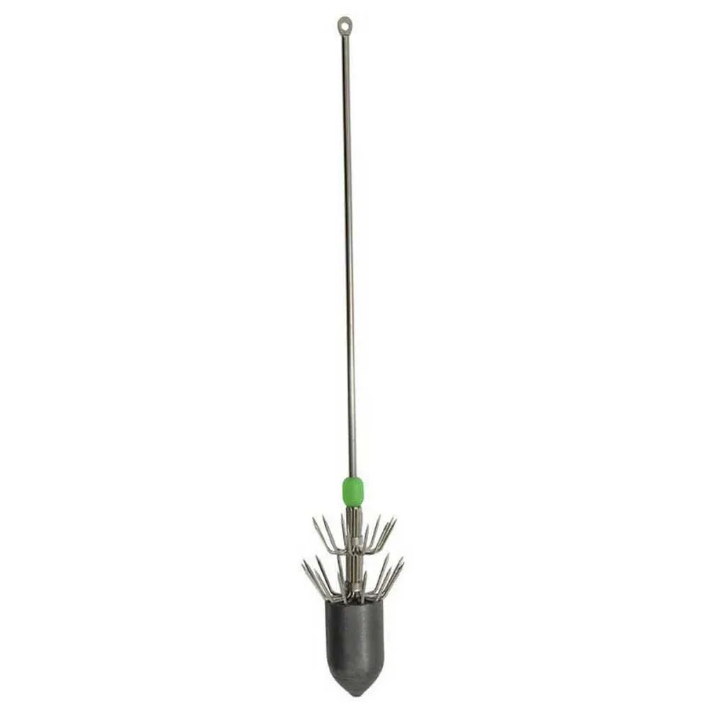 The leaded needle jig is a stainless steel rod equipped with baskets with sharp spikes that threads into a bait fish (eg: sardine) for cephalopod fishing.