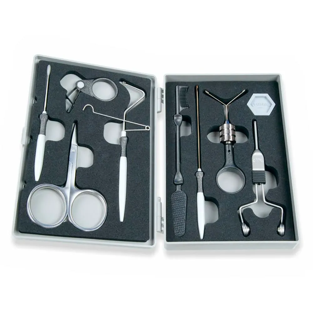 Complete travel set which includes 8 fly tying tools. Supplied in a strong and elegant case whose rubber interior is shaped to give each tool a precise housing. The set includes: small Scissor, Bobtec1 bobbin with adjustable thread tension, Bobbin threader, Finisher-Conical finisher, Bodkin, Hackle pliers, Rotodubbing mini, Pettine comb. Inside detailed instructions of the various tools.