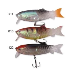 Vinyl minnow with lip and jointed body. Combining the advantages of hard fish and vinyl fish, to create a life-like lure which is highly effective for all types of predators.